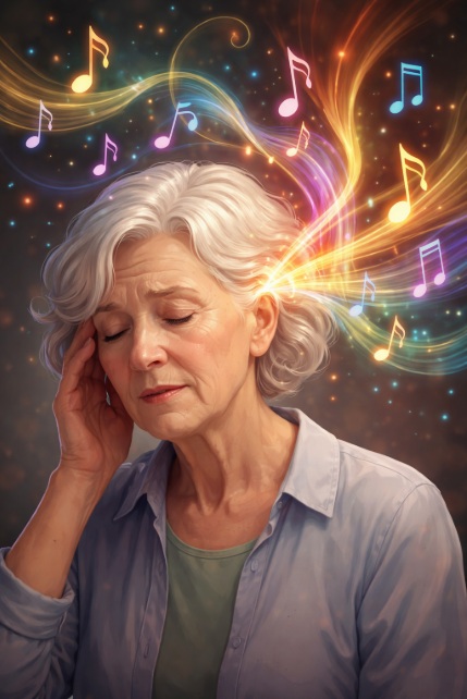 O tema é alucinação auditiva musical (musical hallucinosis/musical ear syndrome).