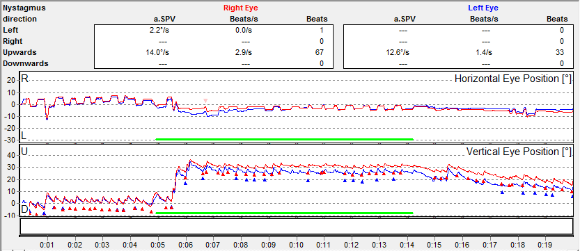 Esse caso, é um caso externo. Um otorrinolaringologista solicitou uma videonistagmografia pensando tratar-se de um caso vestibular periférico. Devemos ficar atentos aos sintomas “bandeira vermelha”. Um distúrbio do equilíbrio acompanhado por diplopia é indicativo de investigação neurológica. Oscilopsia espontânea, aquela em que não precisamos mexer com a cabeça para percebe-la, é resultado da presença do nistagmo. Difere da oscilopsia da hipofunção vestibular bilateral, que somente é notada com a movimentação da cabeça. Como não acompanhei esse caso, somente poderei colocar abaixo os achados do exame realizado.