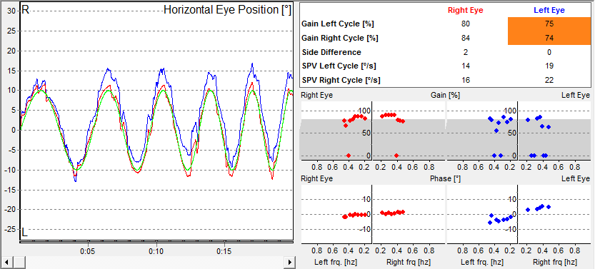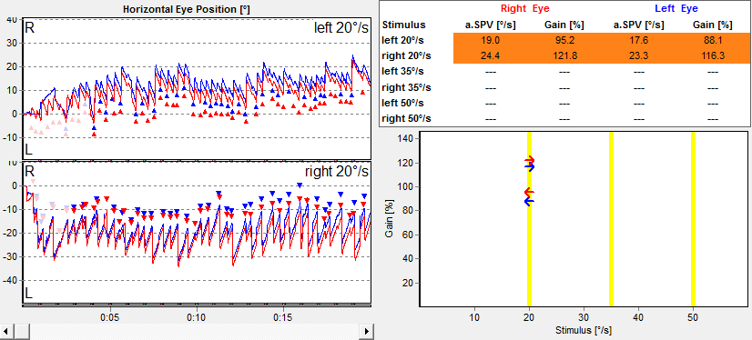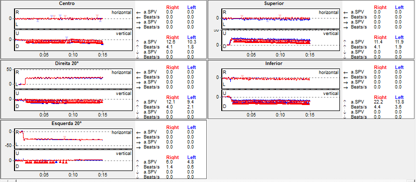 Optocinético horizontal: Optocinético horizontal a 20°/s presente bilateralmente. Interpretação quantitativa (aSPV/ganho) prejudicada pela presença de nistagmo espontâneo vertical de base, com provável superestimação dos parâmetros automáticos (ganho >100%).