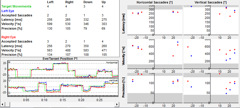 Sacadas: Sacadas horizontais e verticais com velocidades preservadas, sem evidência de lentificação sacádica. Latências dentro do esperado/levemente aumentadas. Observa-se variabilidade da precisão (dismetrias com hipermetria em alguns movimentos horizontais e hipometria em parte dos movimentos verticais), interpretação limitada pelo pequeno número de sacadas aceitas e pela interferência do nistagmo espontâneo.